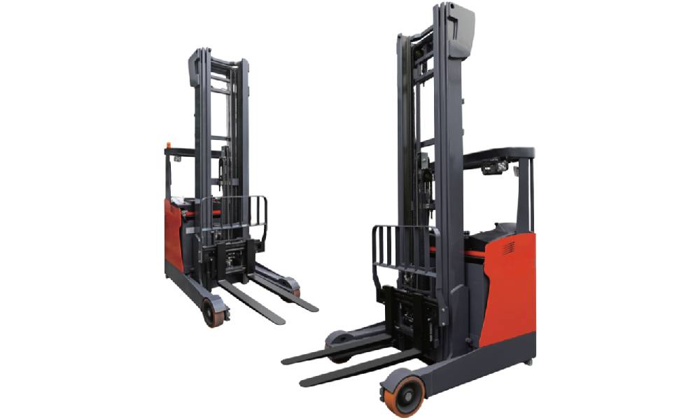An Electric Reach Truck – Seated is a battery-powered warehouse forklift where the operator sits comfortably while handling palletized loads at height.